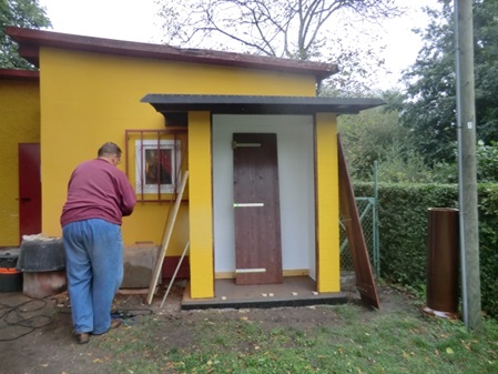 9. September: Die Türen für den Anbau hat Matthias schon gebaut, Marina hat sie gestrichen und Michael hat die Scharniere montiert. Heute werden sie eingesetzt.
