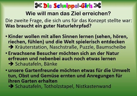 Sehr schnell wurde uns klar, dass selbst der simpelste Naturlehrpfad, bestehend aus Schautafeln zum Thema Natur, wie man ihn in jedem dritten Wald findet, die finanziellen Möglichkeiten der Schnippel-Girls bei weitem übersteigt. Doch wir wären nicht die Schnippel-Girls wenn wir uns vor Herausforderungen drücken würden.